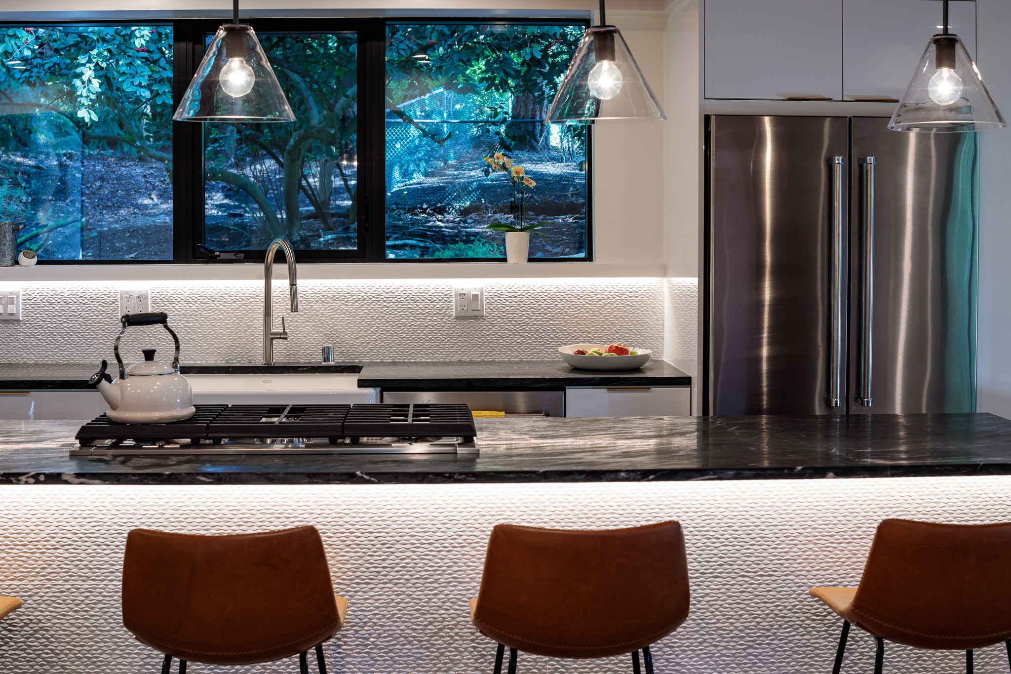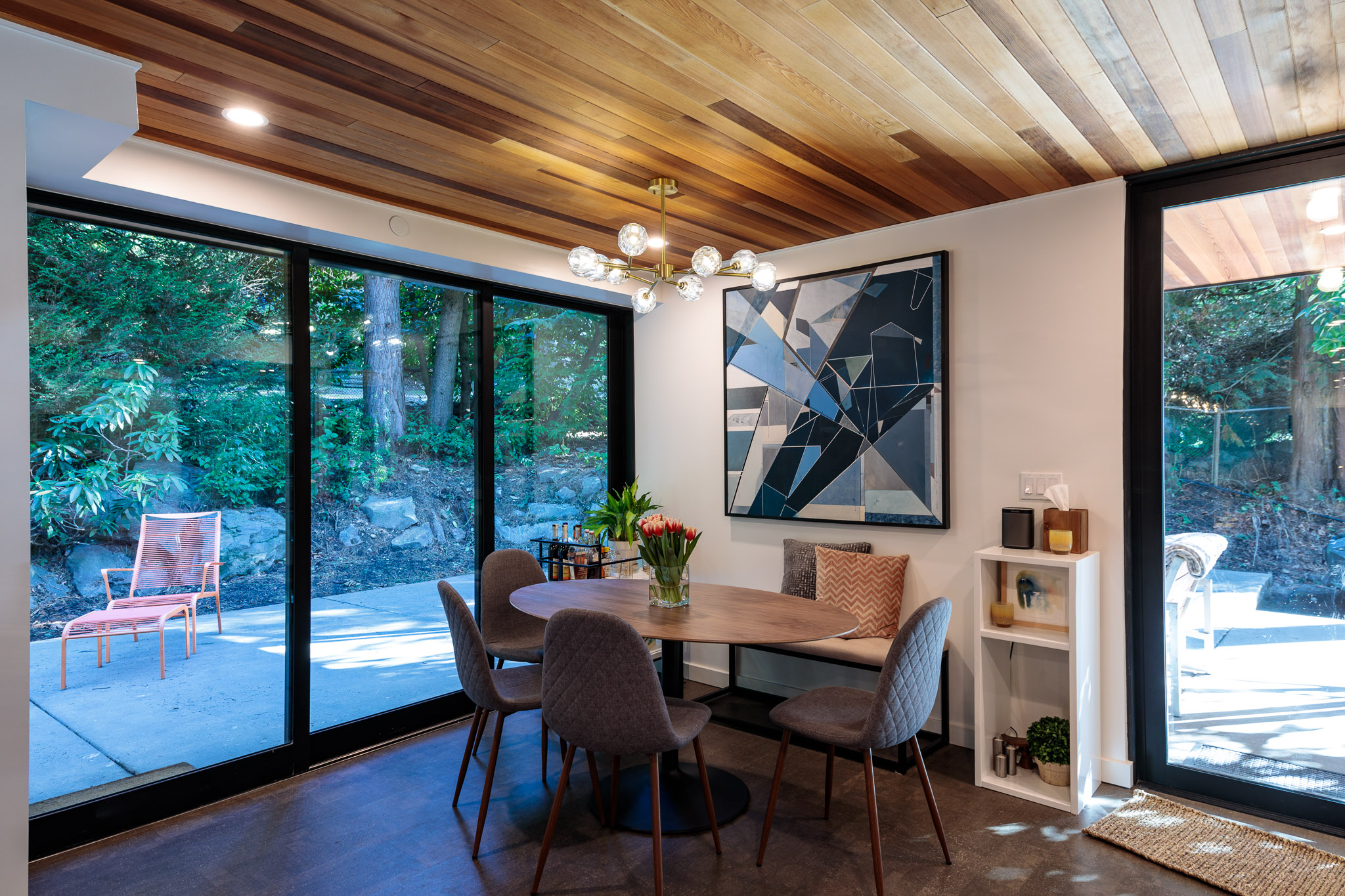 A complete restoration of a Fred Bassetti designed home. The original mid-century design was kept intact, while re-working the floor plan and updating all finishes. Stacking sliding doors were added to provide indoor/outdoor entertaining spaces. Cedar paneling was moved from the walls to the ceiling and exterior soffits, bringing warmth to the design. The original angled fireplace hood and brick were refinished but left intact.