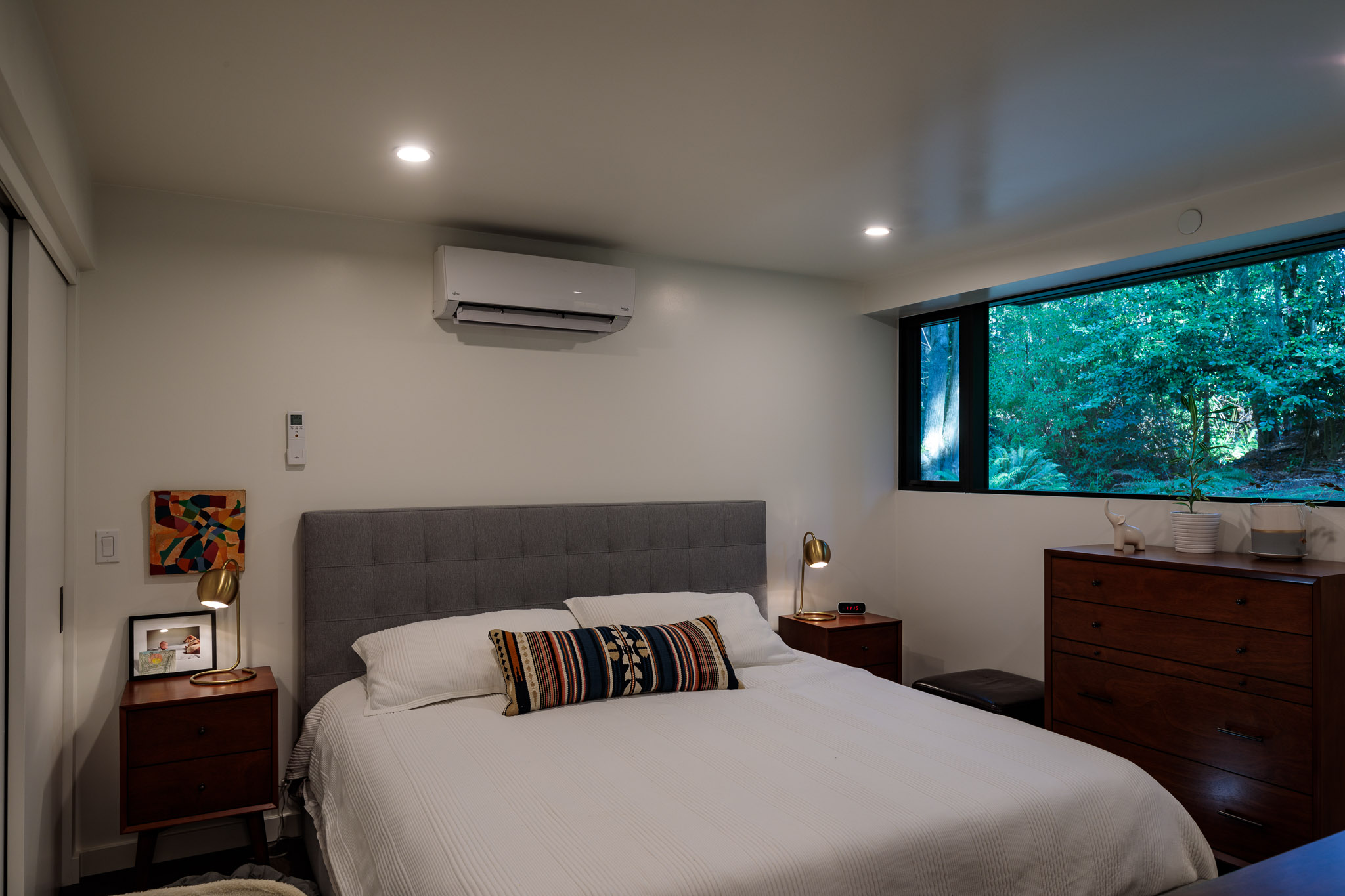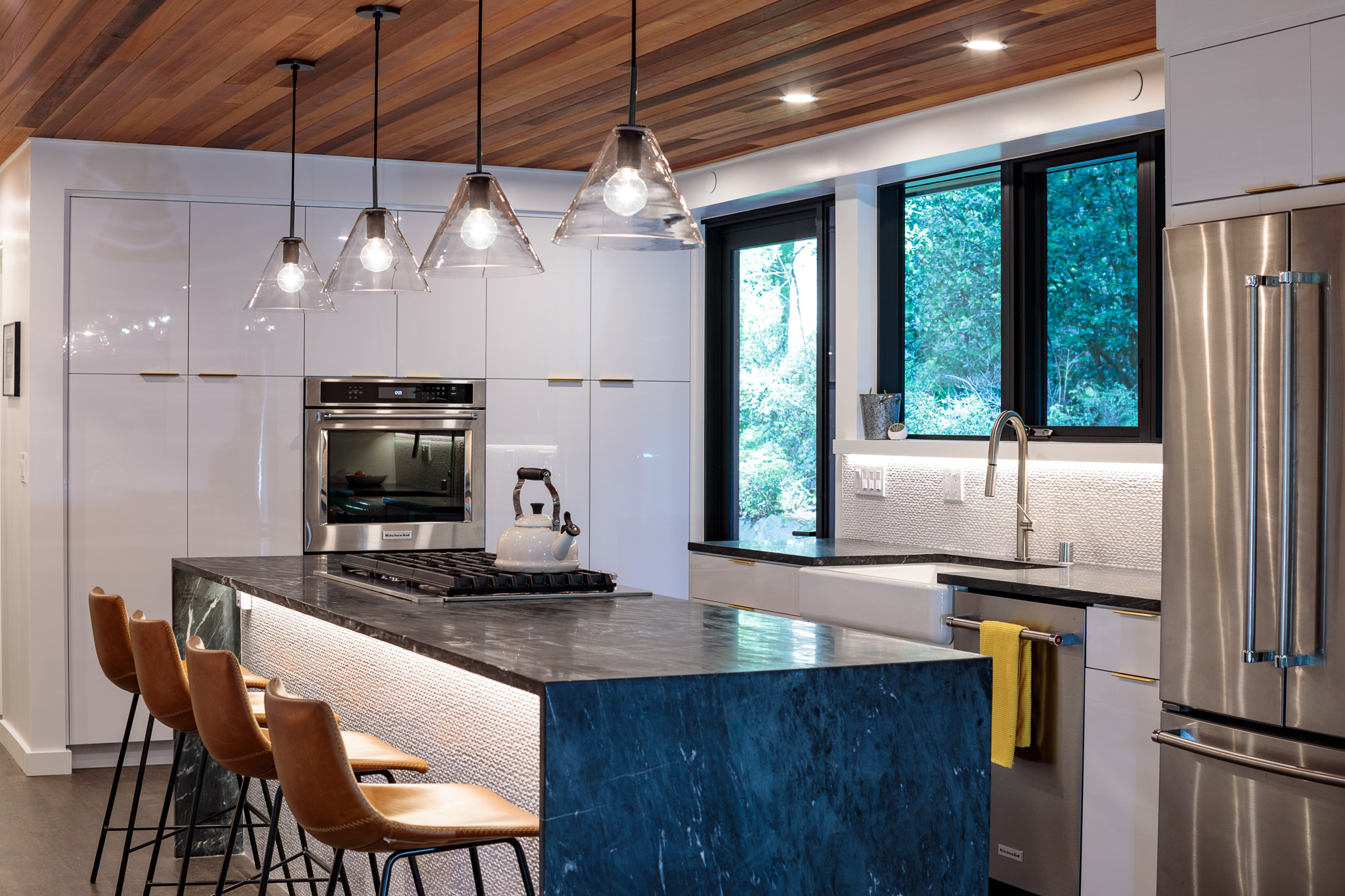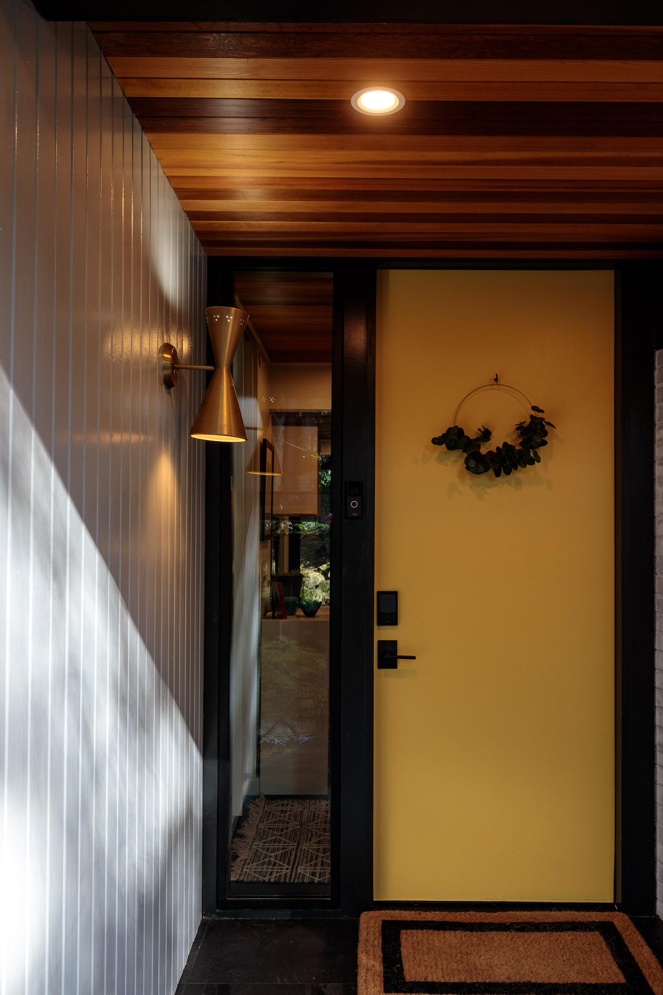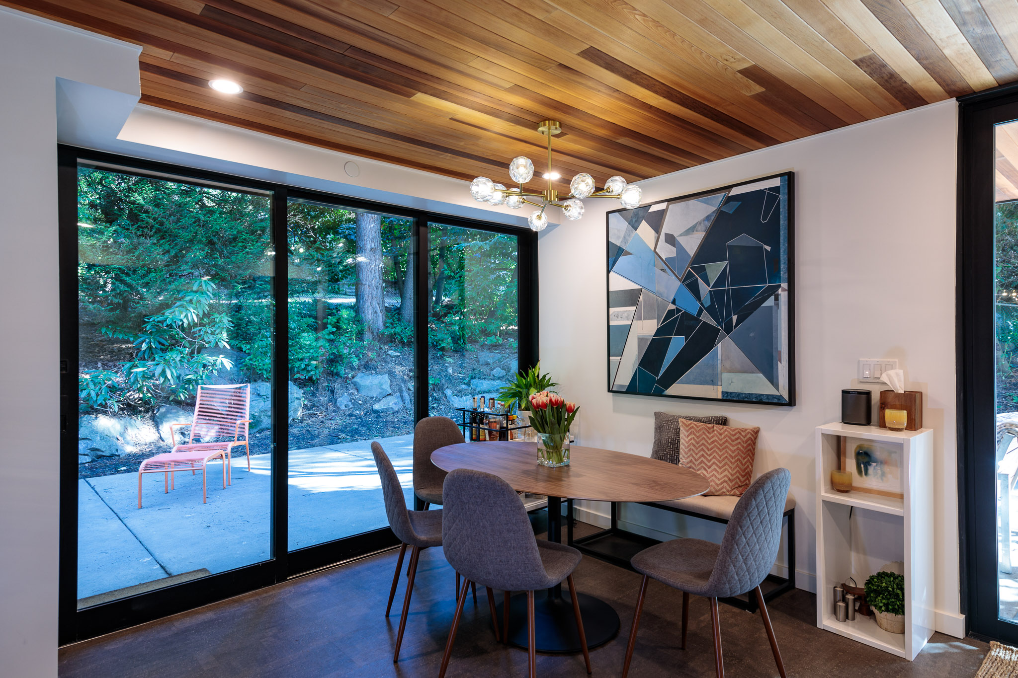 A complete restoration of a Fred Bassetti designed home. The original mid-century design was kept intact, while re-working the floor plan and updating all finishes. Stacking sliding doors were added to provide indoor/outdoor entertaining spaces. Cedar paneling was moved from the walls to the ceiling and exterior soffits, bringing warmth to the design. The original angled fireplace hood and brick were refinished but left intact.