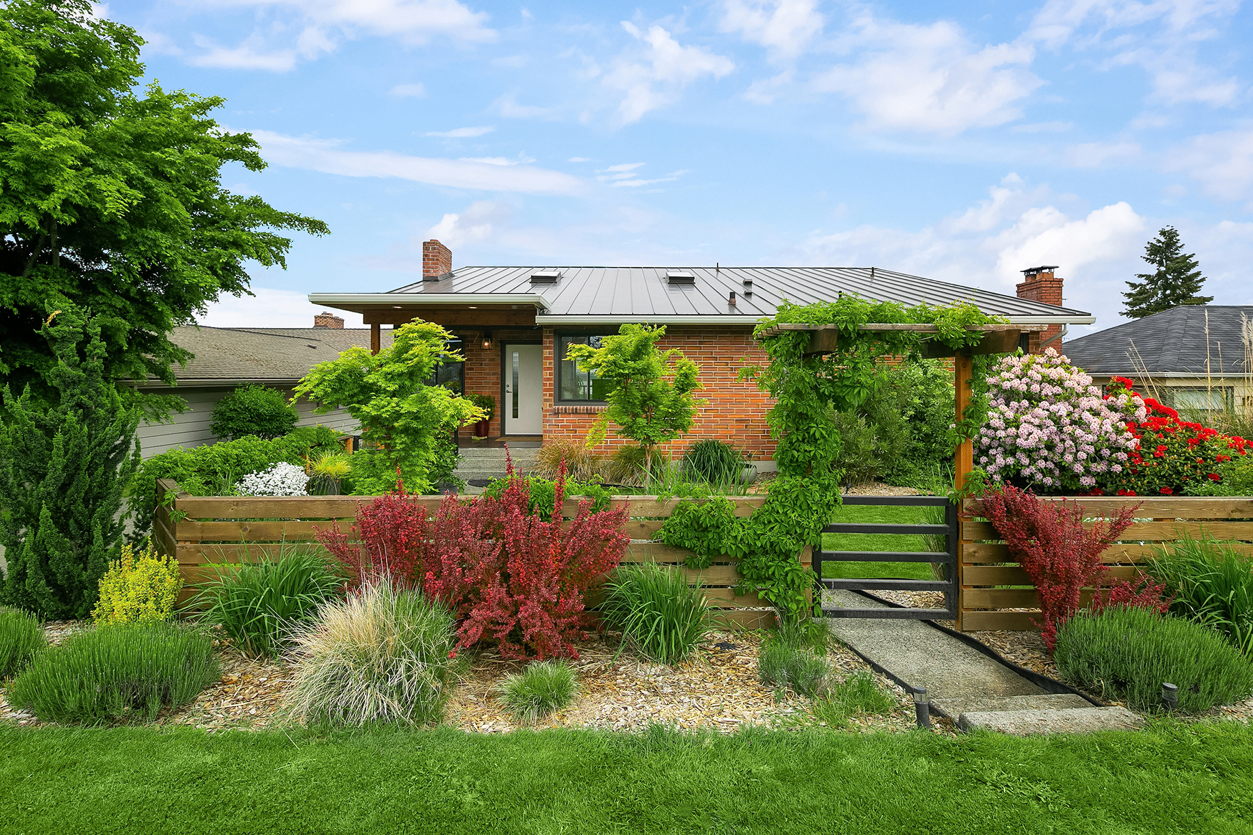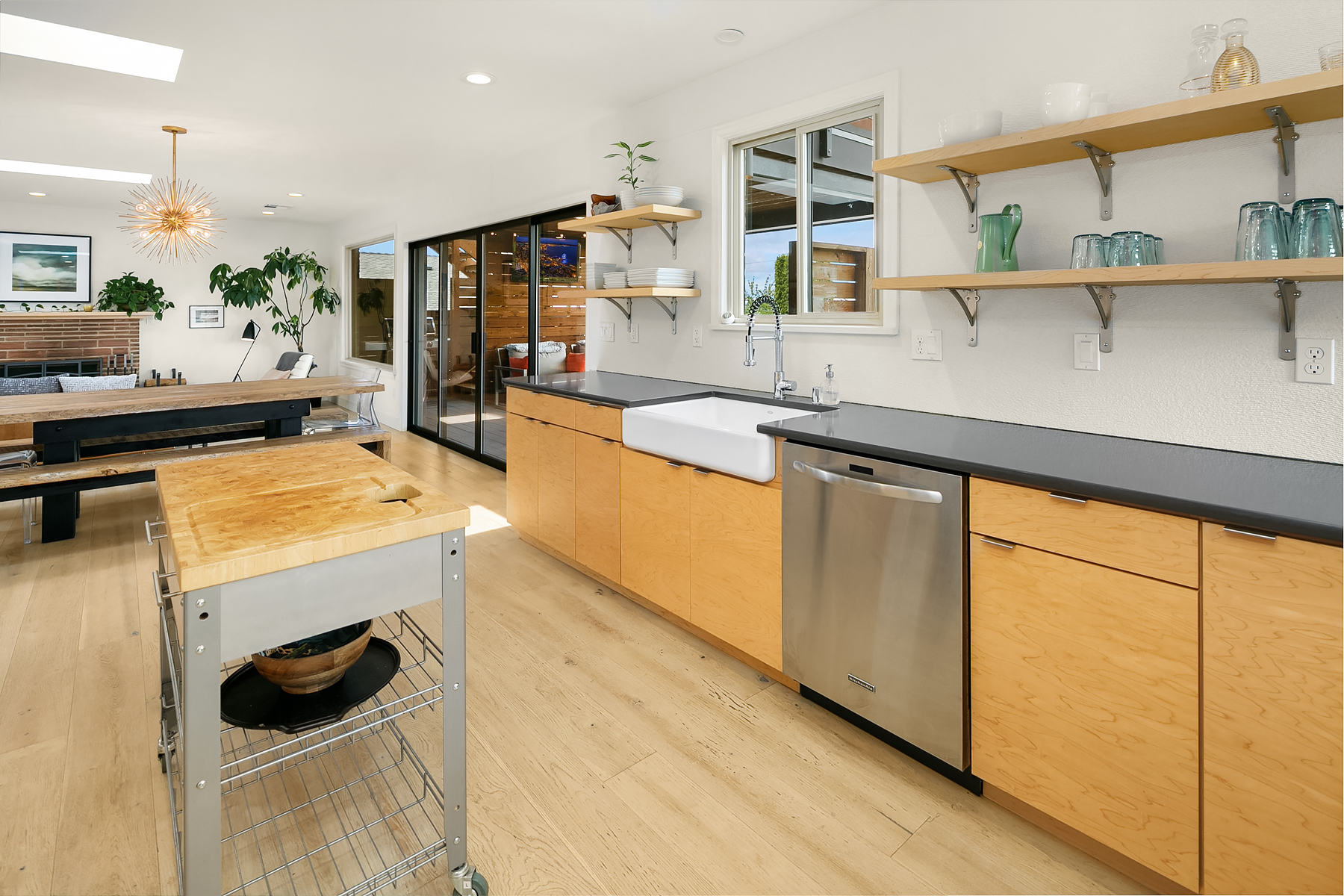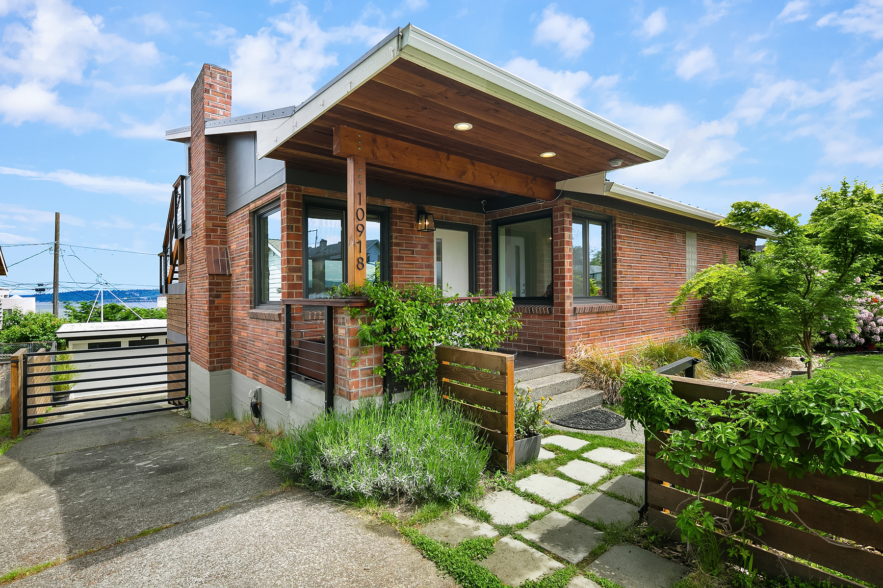 Studs out remodel on the interior. The roof was removed and replaced with a metal shed roof and covered entry to update the architectural style . A steel framed two story deck was added in the rear yard to capture views and provide two covered outdoor living spaces. A detached carport was converted into a garage, and the property was completely fenced and landscaped.