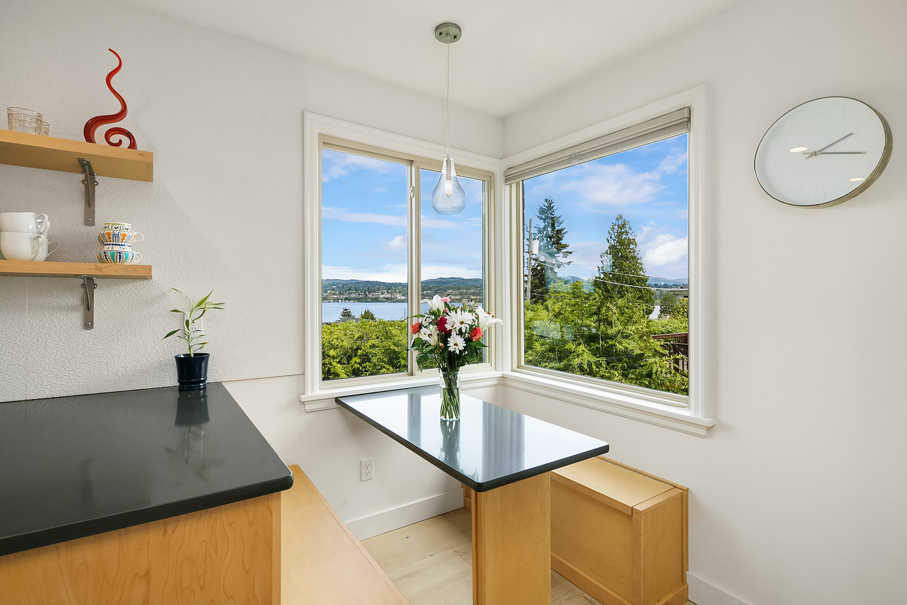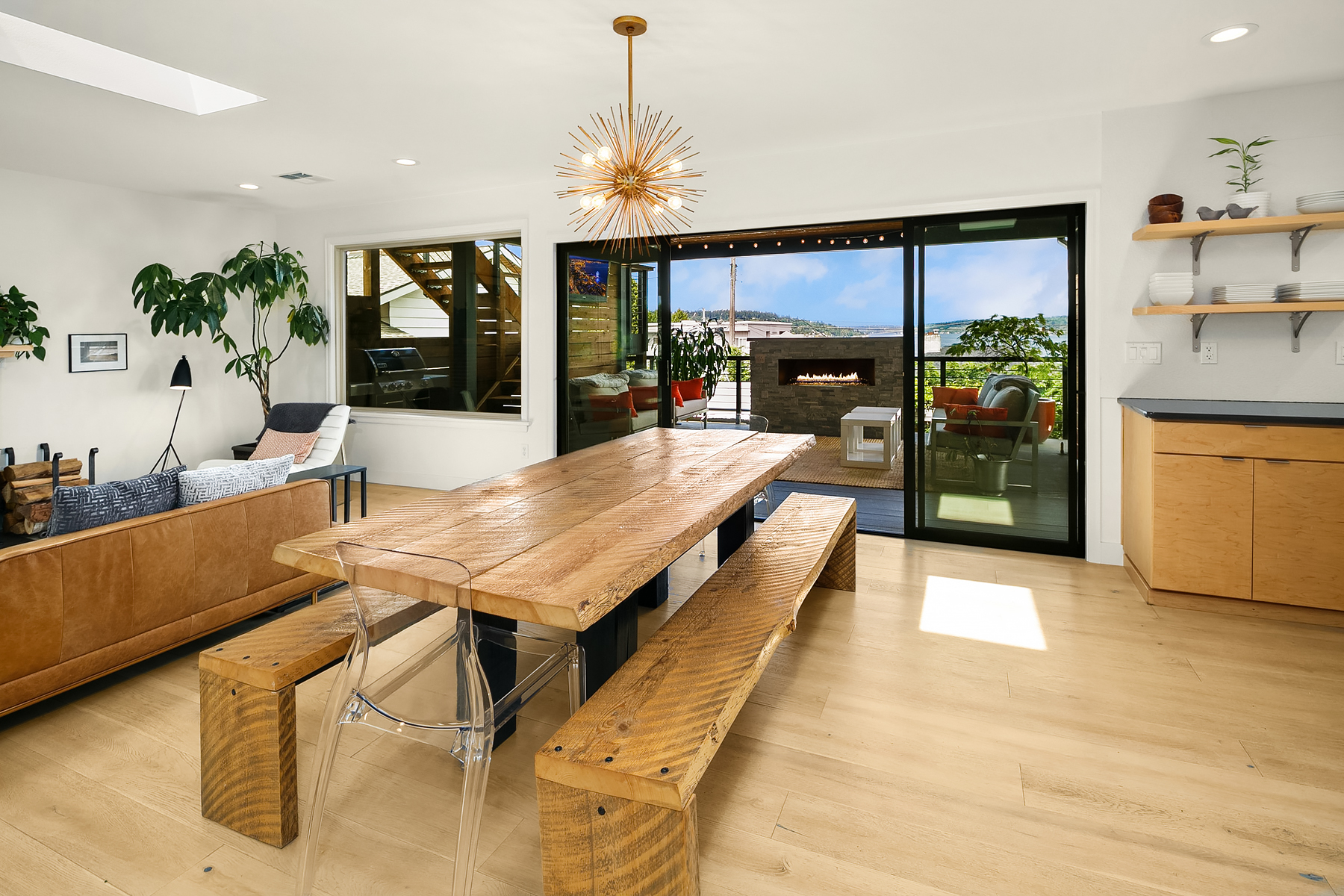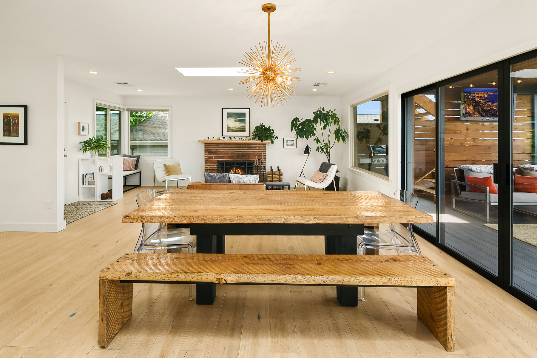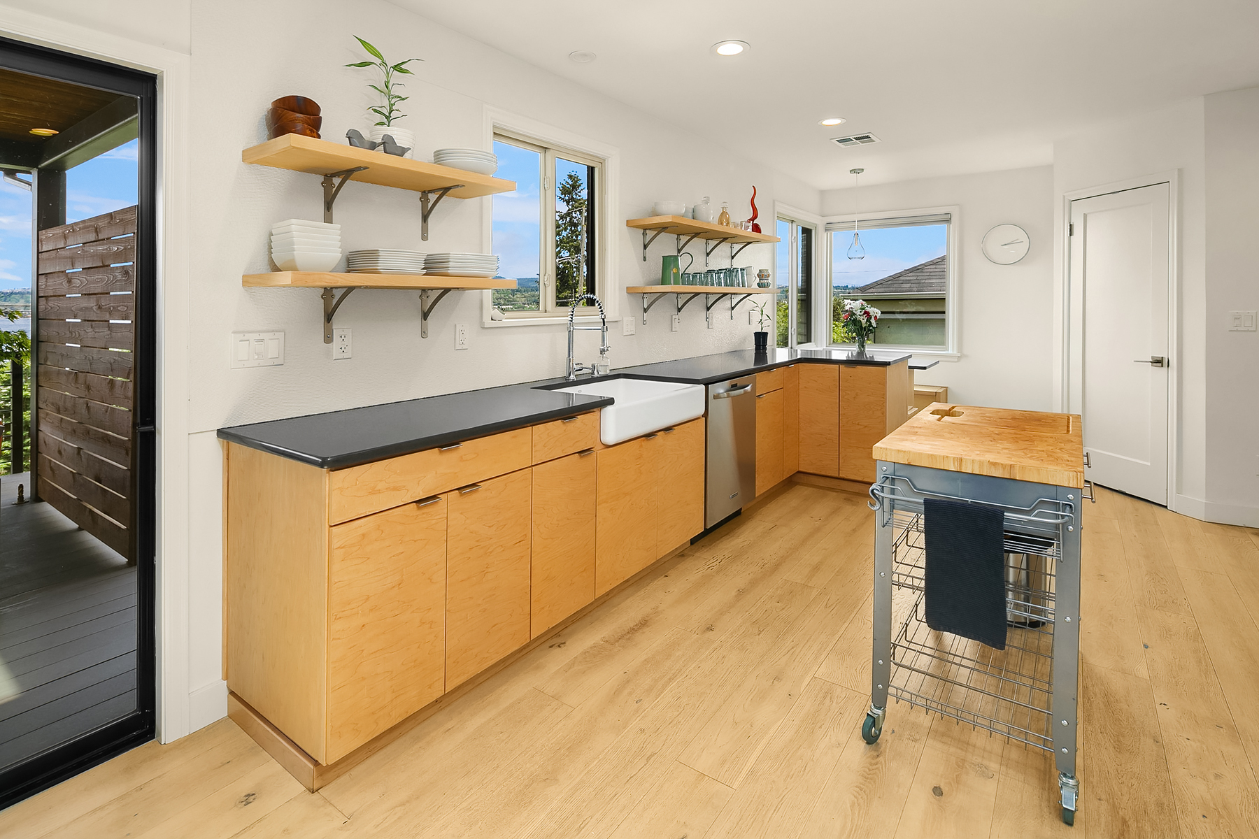 Studs out remodel on the interior. The roof was removed and replaced with a metal shed roof and covered entry to update the architectural style . A steel framed two story deck was added in the rear yard to capture views and provide two covered outdoor living spaces. A detached carport was converted into a garage, and the property was completely fenced and landscaped.